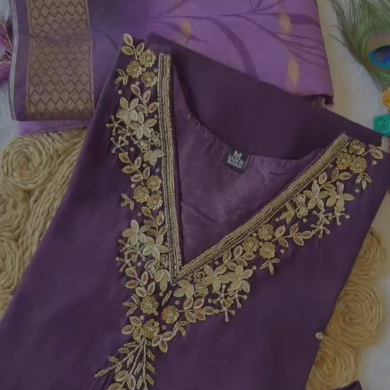 Designer Roman Silk Embroidery & Sequence Work Dark Purple Kurti Pant With Dupatta Set