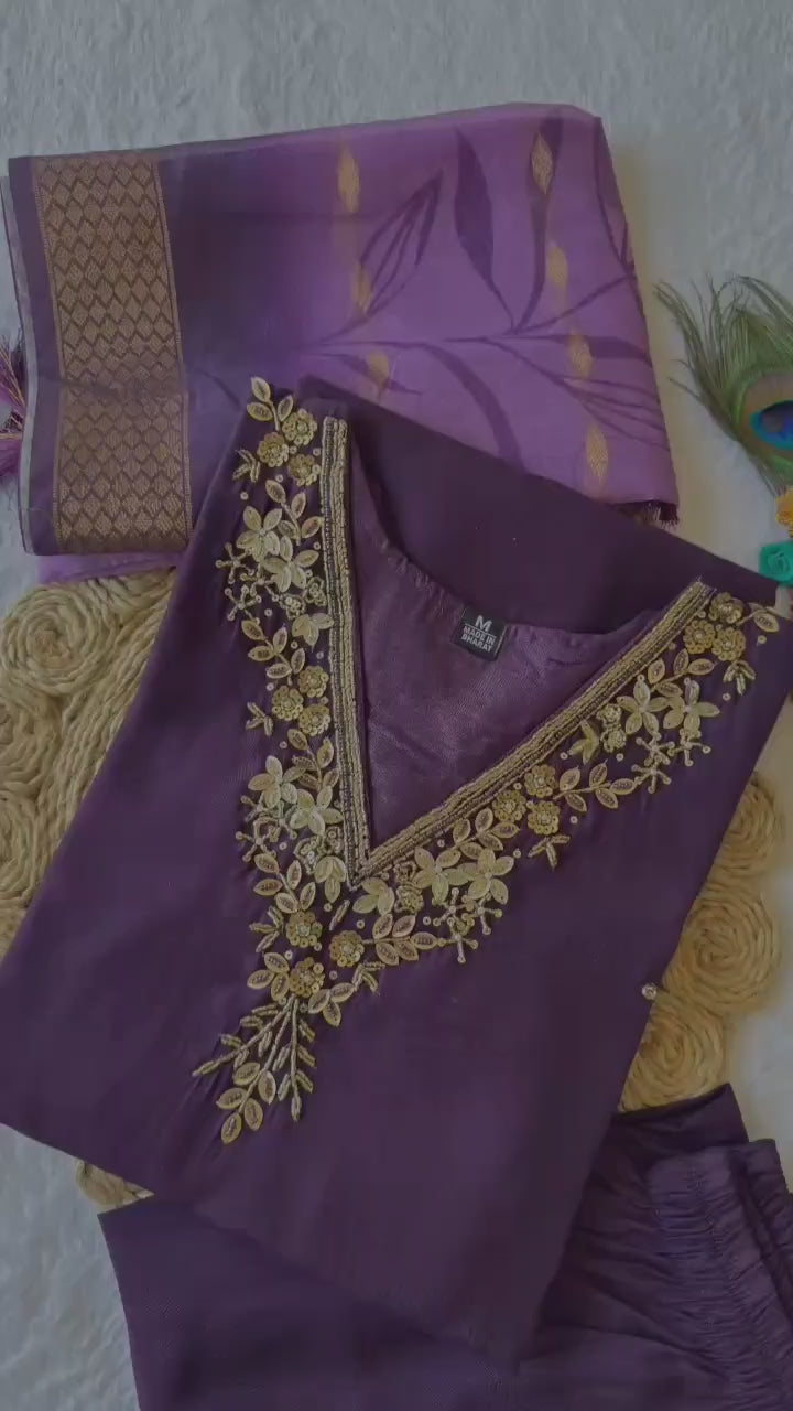 ♥️ Made from luxurious Roman silk in an elegant dark purple shade, this designer set features intricate embroidery and sparkling sequence work. Complete with matching pants and a coordinated dupatta, it exudes sophistication, making it perfect for festive and special occasions.