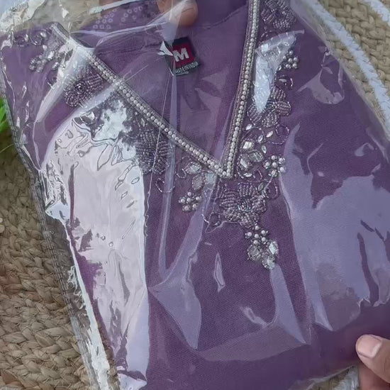 Lavender Designer Premium Roman Silk Hand Work Kurti Pant With Dupatta