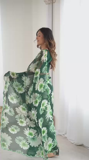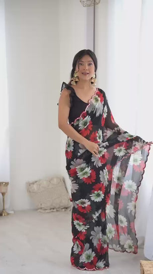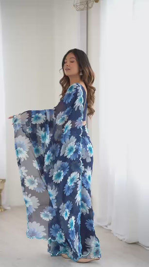 Crafted in luxurious georgette silk, this saree features a beautiful all-over print that exudes charm and elegance. The highlight lies in its delicate mirror work border, adding a touch of sparkle and festive appeal. Lightweight, soft, and flowy, it drapes effortlessly, making it ideal for parties, festive gatherings, and special occasions. Paired with a matching blouse piece, this saree brings together style, comfort, and timeless grace.