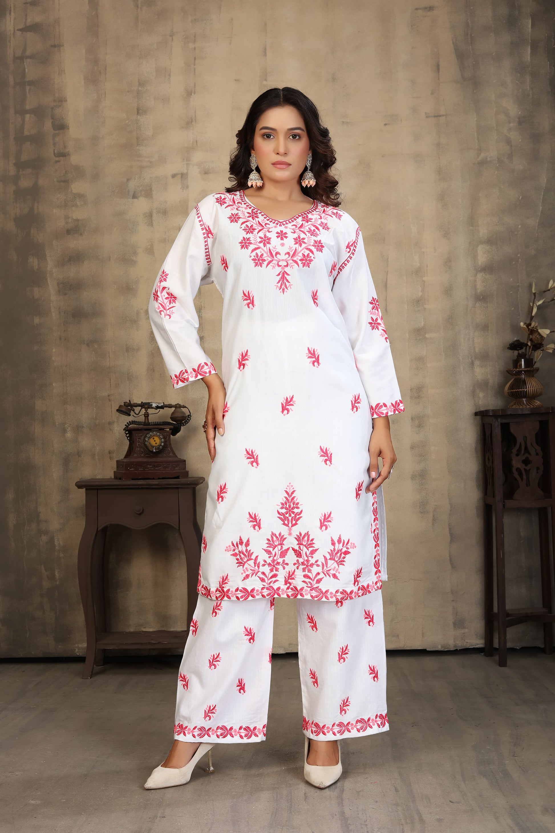 New Stylish Heavy Rayon Slub With Chikankari Embroidery Work Kurti Pant Set