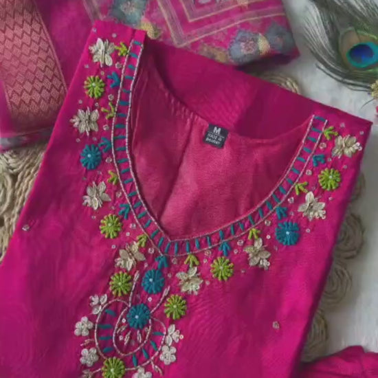 Pink Designer Premium Roman Silk Hand Work Kurti Pant With Dupatta Set