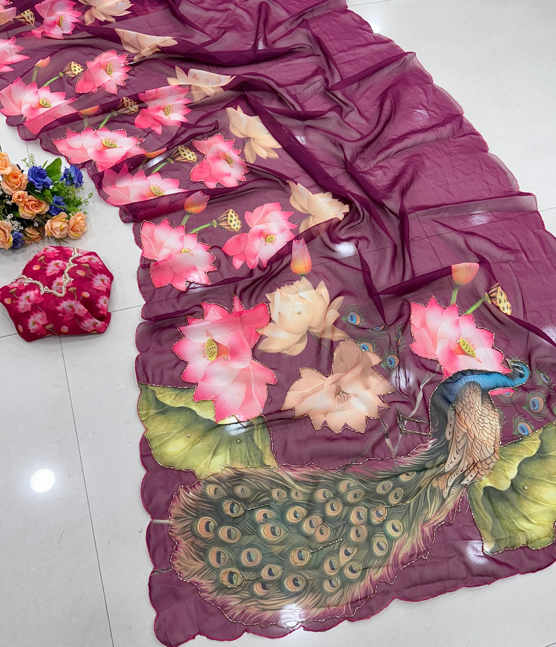 Premium Soft & Smooth Chiffon Floral Print Saree With Embroidery & Pipe Work Border
