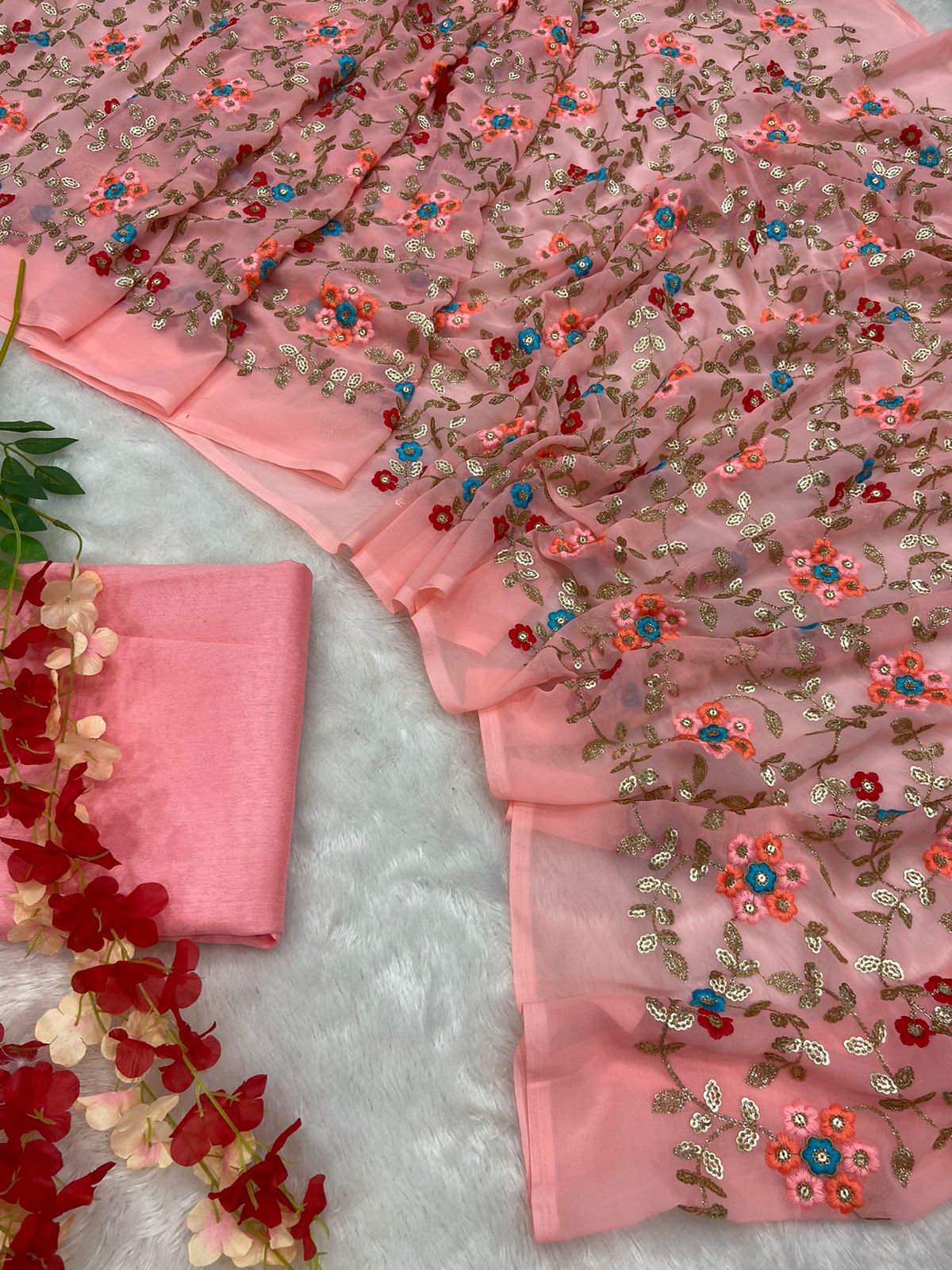 Stunning Premium Faux Georgette Saree With Sequins & Thread Embroidery Work