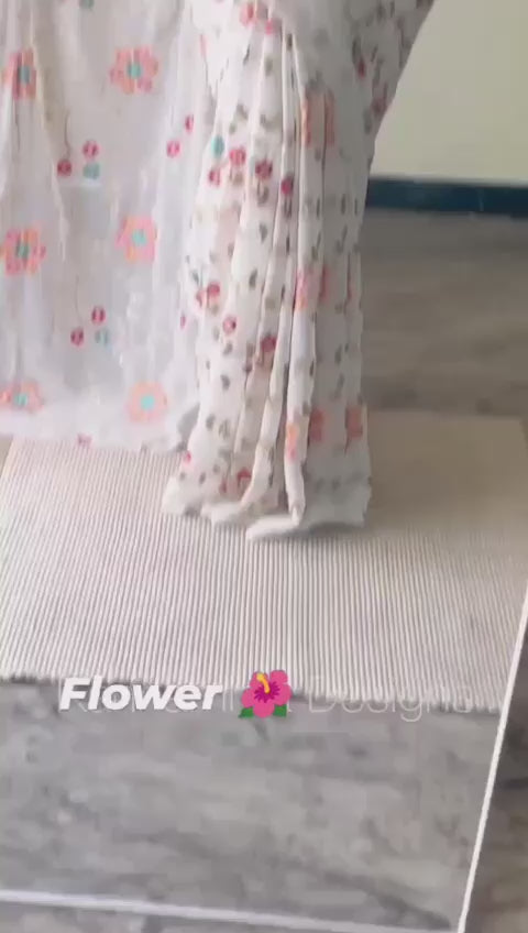 A stunning faux georgette saree featuring beautiful prints enhanced with sequins and thread embroidery work. Paired with a matching blouse, this saree is ideal for festive, wedding, and special occasion wear.
