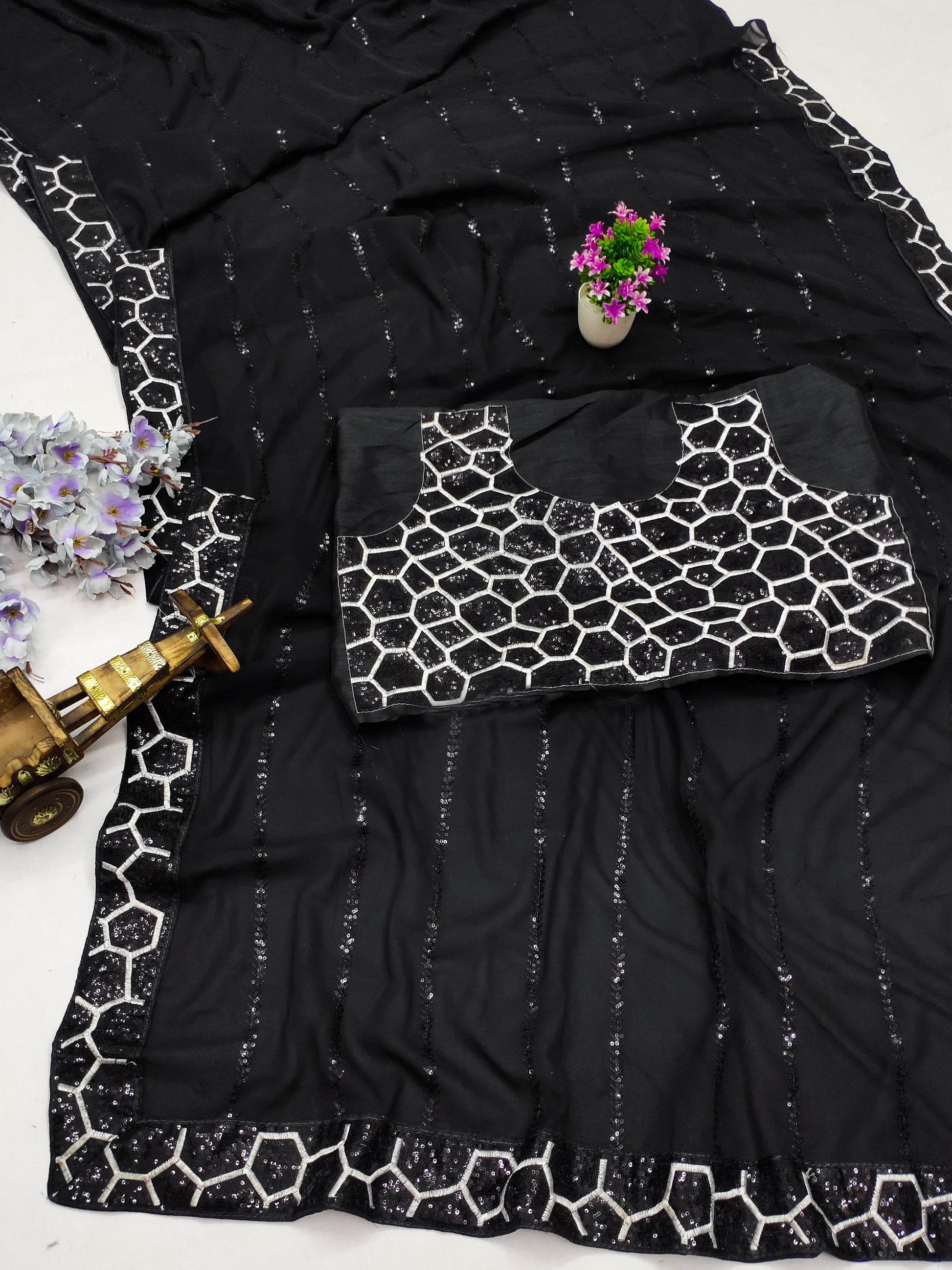 Pure Heavy Georgette Saree With Embroidery Sequins Work & Fancy Lace Border