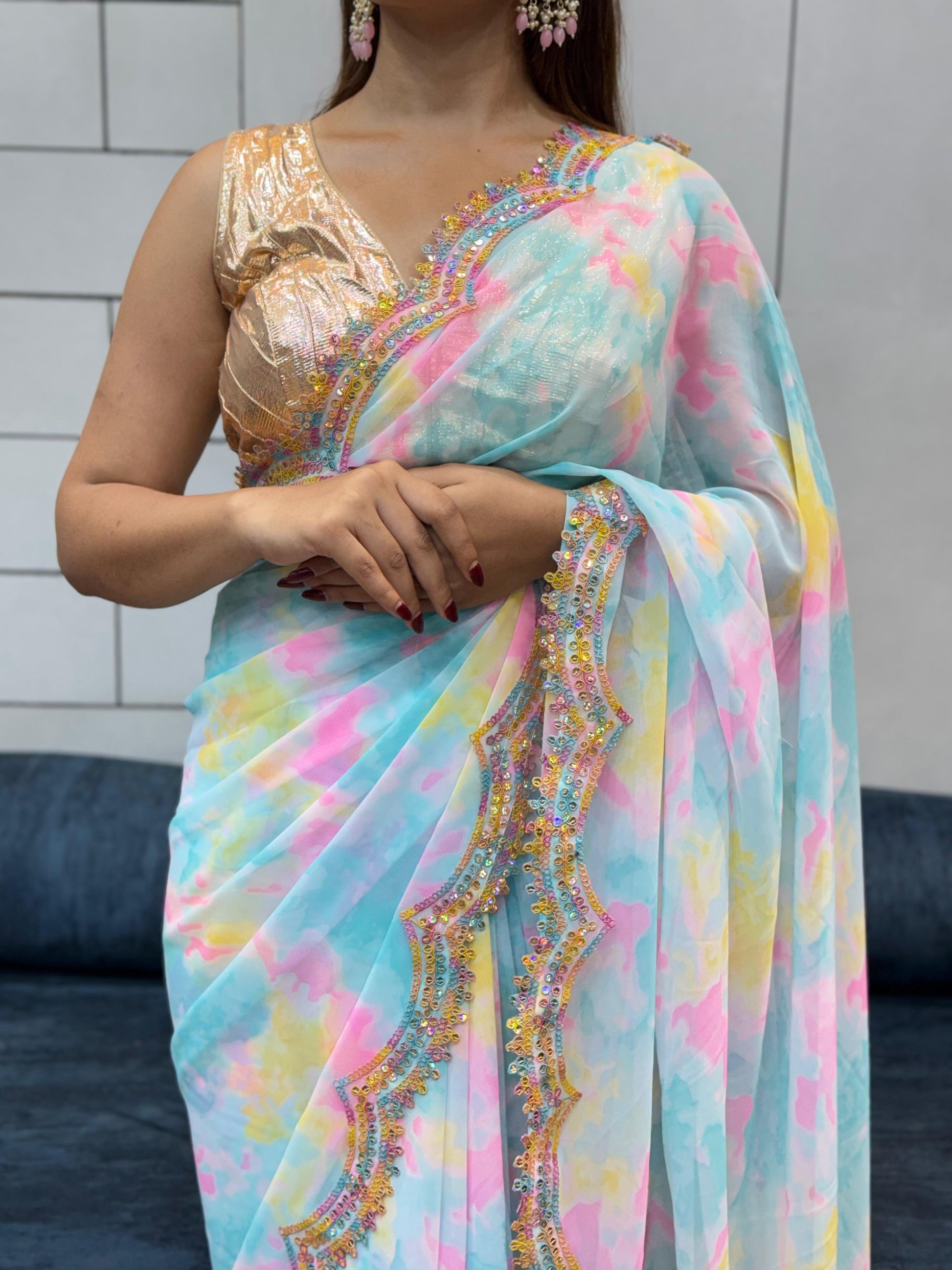Celebrity Style Soft Faux Georgette Print Saree With Coding Sequence Rainbow Lace Work