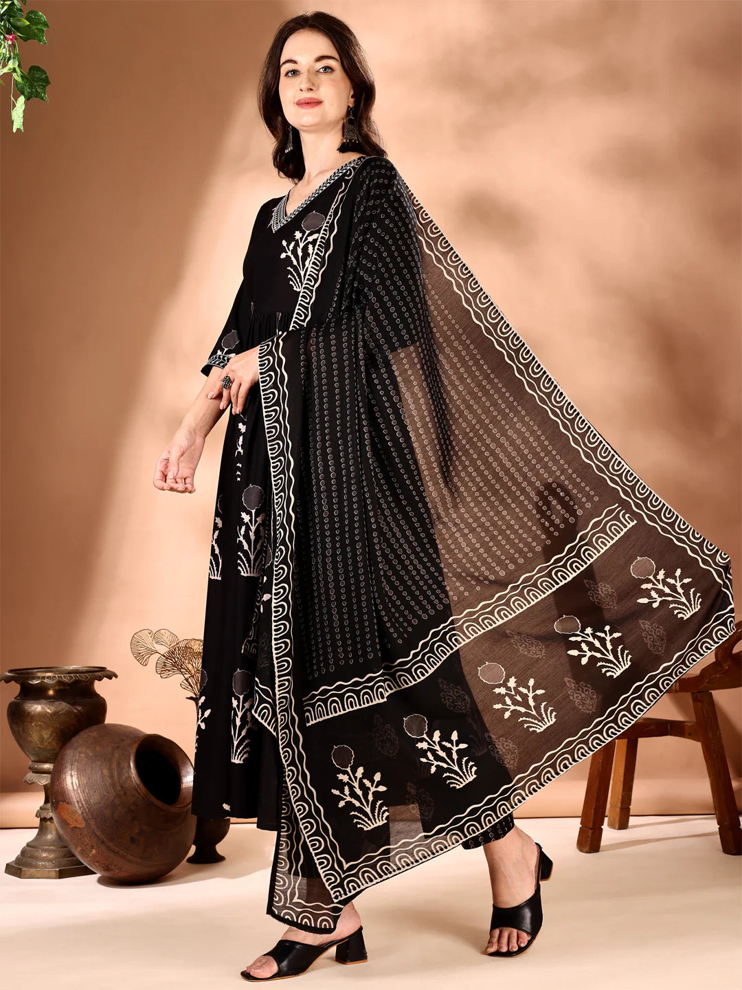 • Kurta : The black kurta features intricate embroidery and ethnic motifs, adding depth and sophistication to the outfit. Its flared design provides a graceful silhouette, while the three-quarter sleeves and V neckline ensure comfort and style.