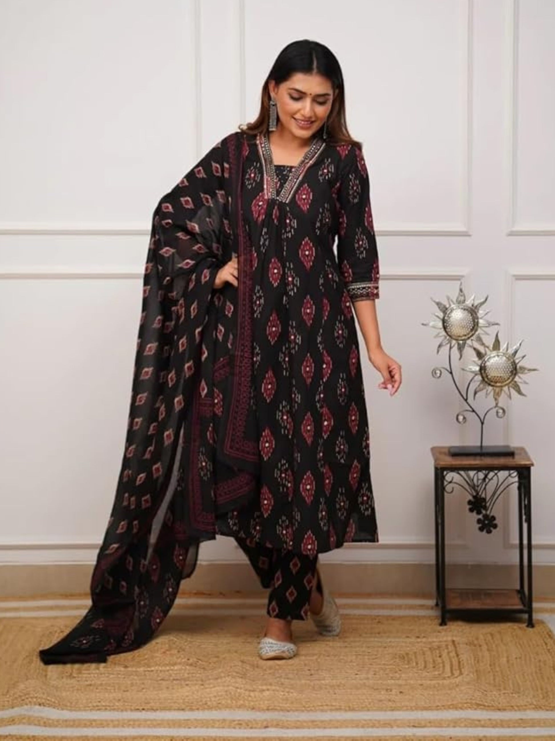 Women's Black Printed A-Line Kurta Pant With Dupatta