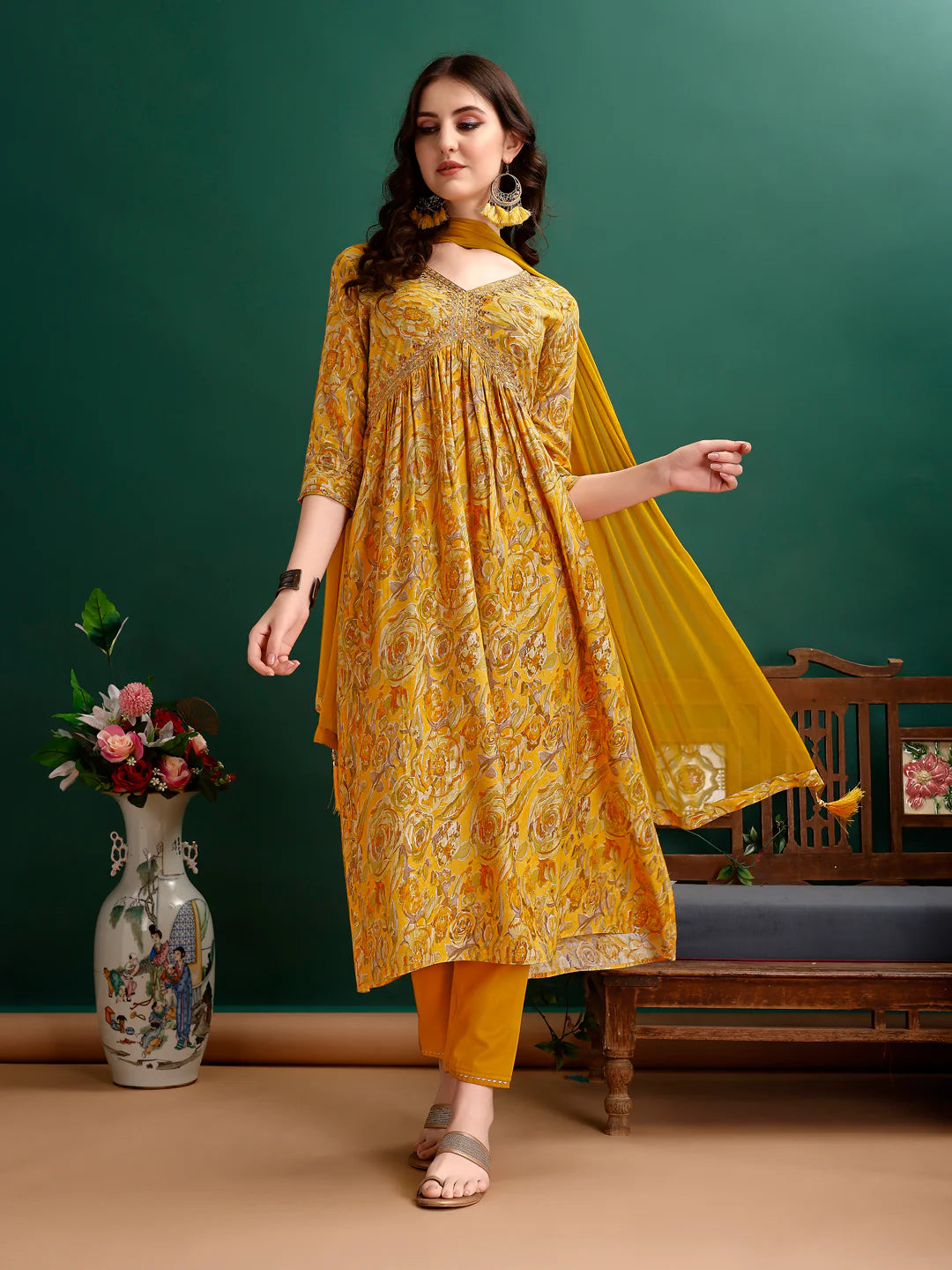 Add a pop of sunshine to your ethnic wardrobe with our Women’s Mustard Alia Cut Floral Printed & Embroidered A-Line Premium Rayon Kurta with Pant & Dupatta Set. This vibrant ensemble is ideal for festive celebrations, casual outings, or special occasions.