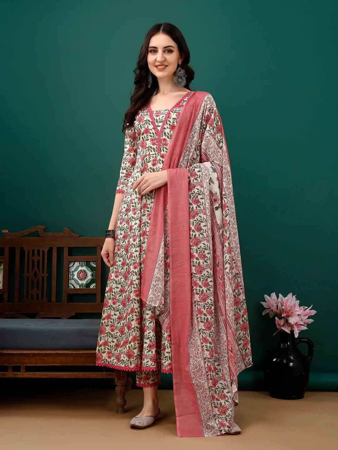 Women's Pink Floral Printed Anarkali Cotton Kurta Pant With Dupatta