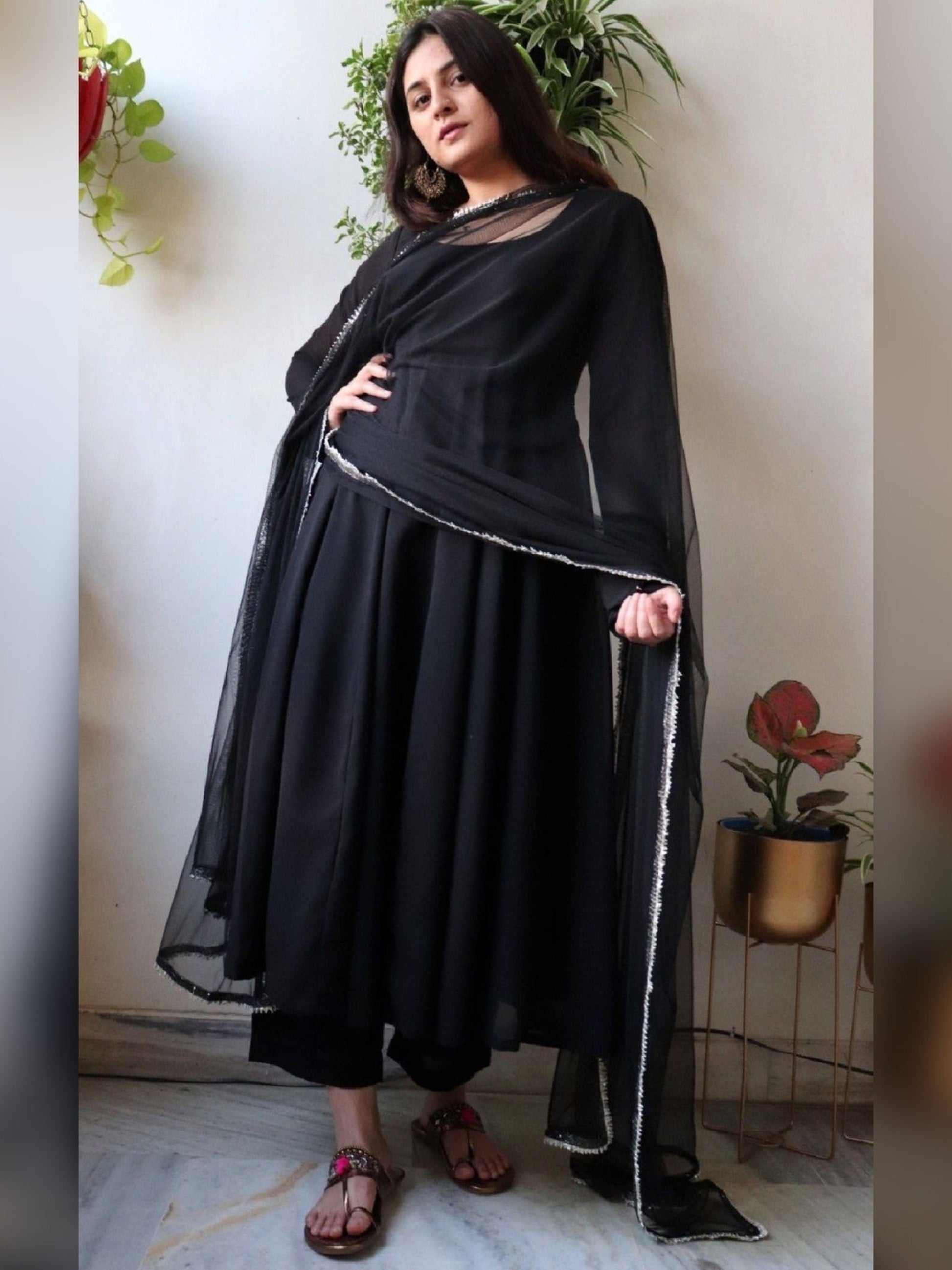 Solid Black Gher Style Cotton Kurta Pant With Dupatta
