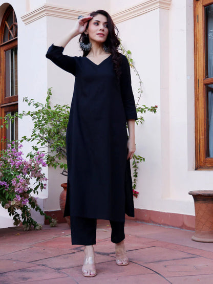 Turn heads with the Women's Solid Classic Bold Black Kurta Pant Set—a timeless, statement-making ensemble inspired by celebrity fashion.